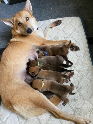 Enya gave natural birth to 6 healthy puppies, 5 females and 1 male. Five puppies found wonderful homes and we kept the first born (red puppy), who is now our beautiful, all grown Kiana.